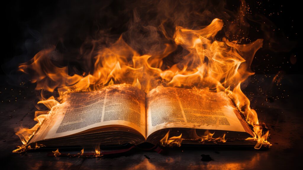 A man and a Pastor, whose identity is uncertain and would remain private unless confirmed and instructed, is shown standing behind a pulpit adjusting his glasses. A Bible was resting on the podium when suddenly a bright fire burst out of its hallowed pages!
